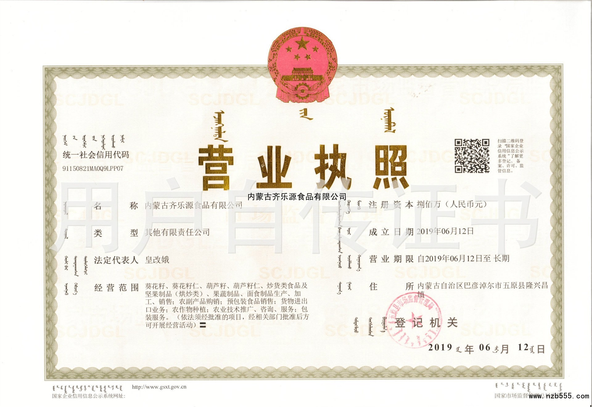 榮譽(yù)資質(zhì) 內(nèi)蒙古齊樂源食品有限公司