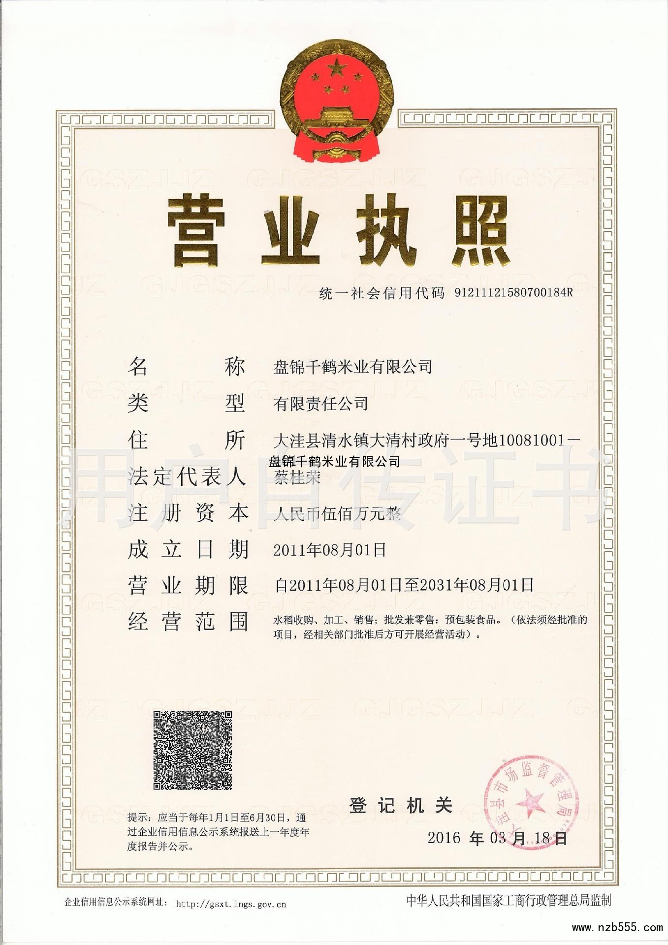| 發(fā)證機(jī)構(gòu): | 大洼縣市場監(jiān)督管理居 | 發(fā)證時(shí)間 : | 2016-03-18 |