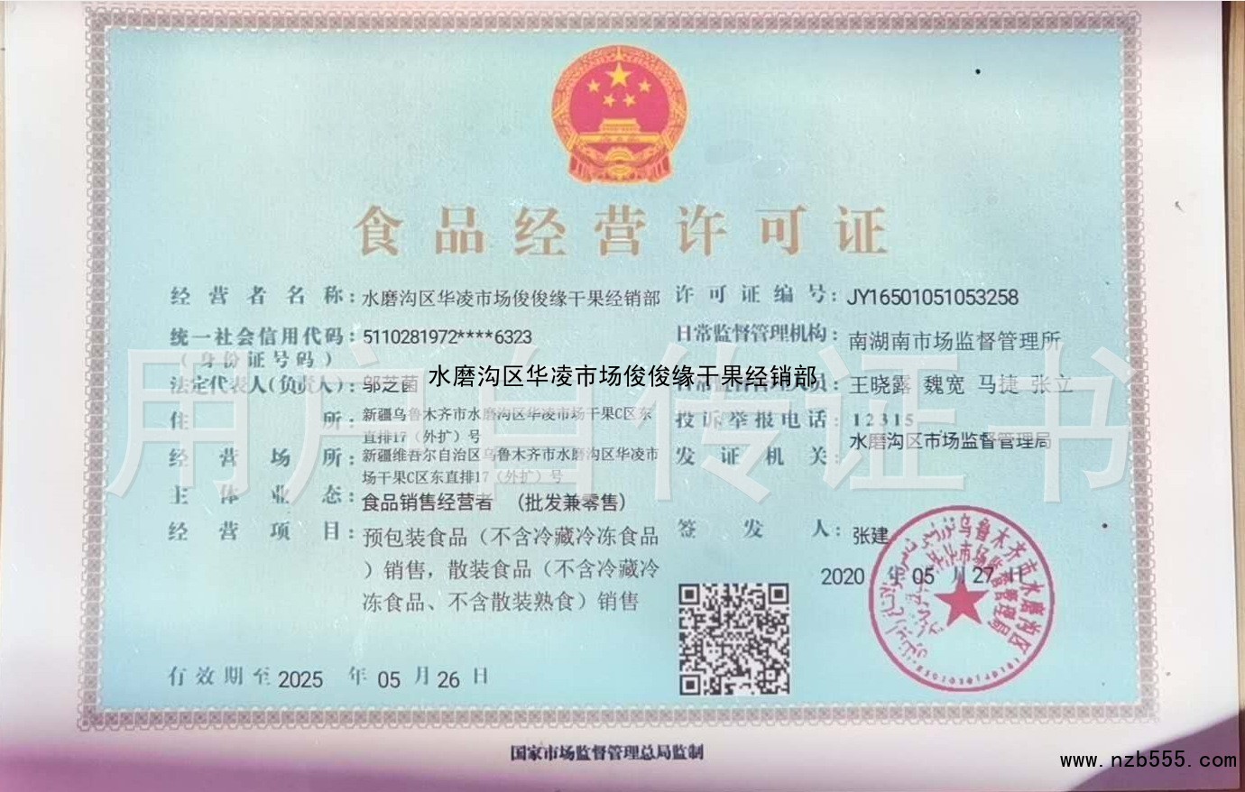 | 發(fā)證機(jī)構(gòu): | 烏魯木齊市水磨溝區(qū)市場監(jiān)督管理局 | 發(fā)證時間 : | 2020-05-27 |