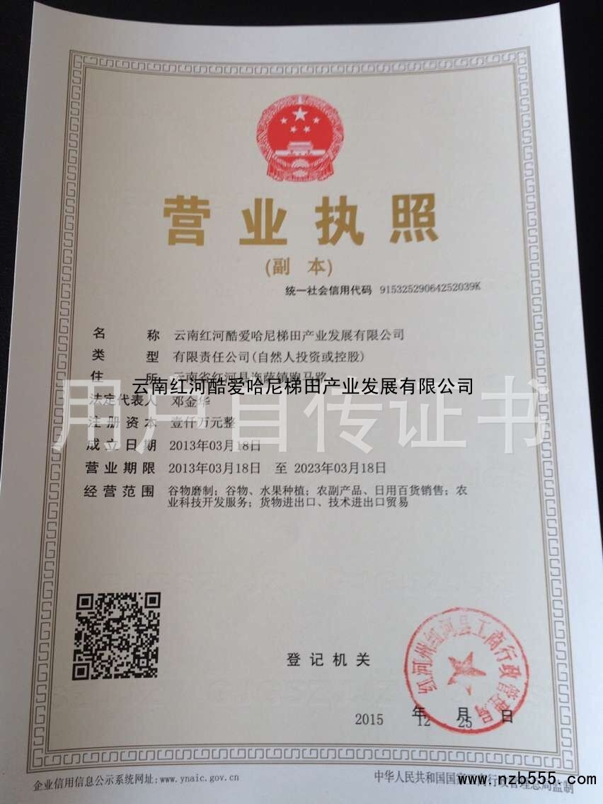 榮譽(yù)資質(zhì) 云南紅河酷愛哈尼梯田產(chǎn)業(yè)發(fā)展有限公司