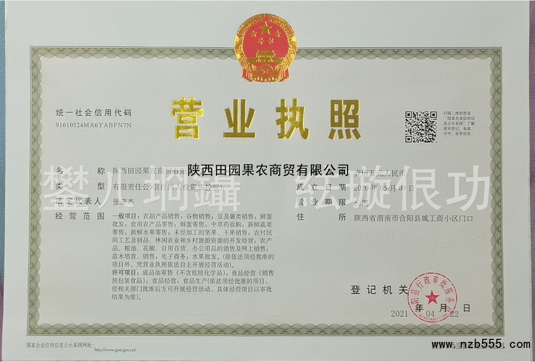 首頁 > 榮譽(yù)資質(zhì) > 陜西田園果農(nóng)商貿(mào)有限公司