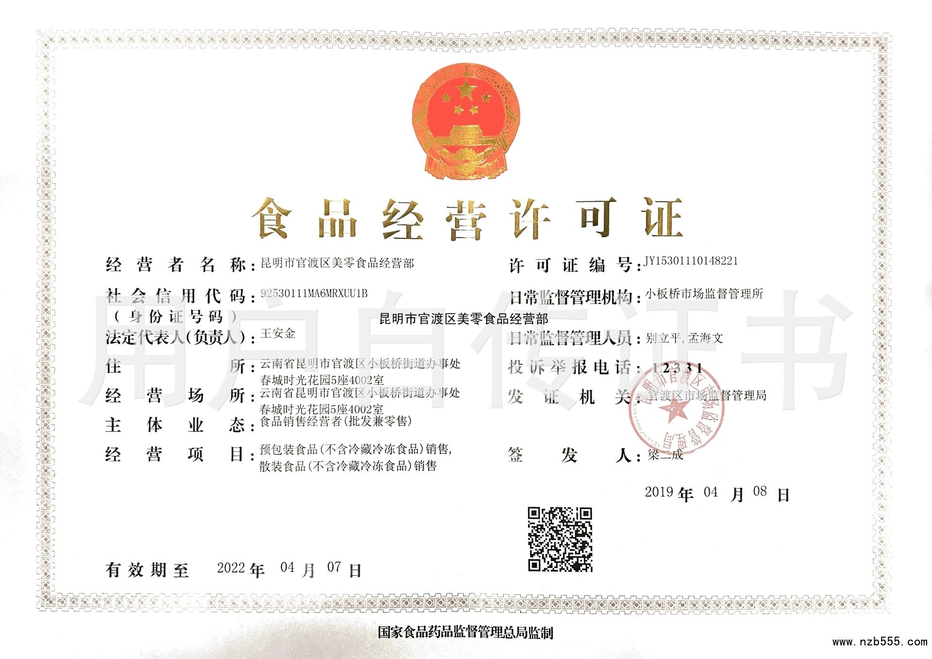 | 發(fā)證機(jī)構(gòu): | 昆明市官渡區(qū)市場(chǎng)監(jiān)督管理局 | 發(fā)證時(shí)間 : | 2019-04-08 |