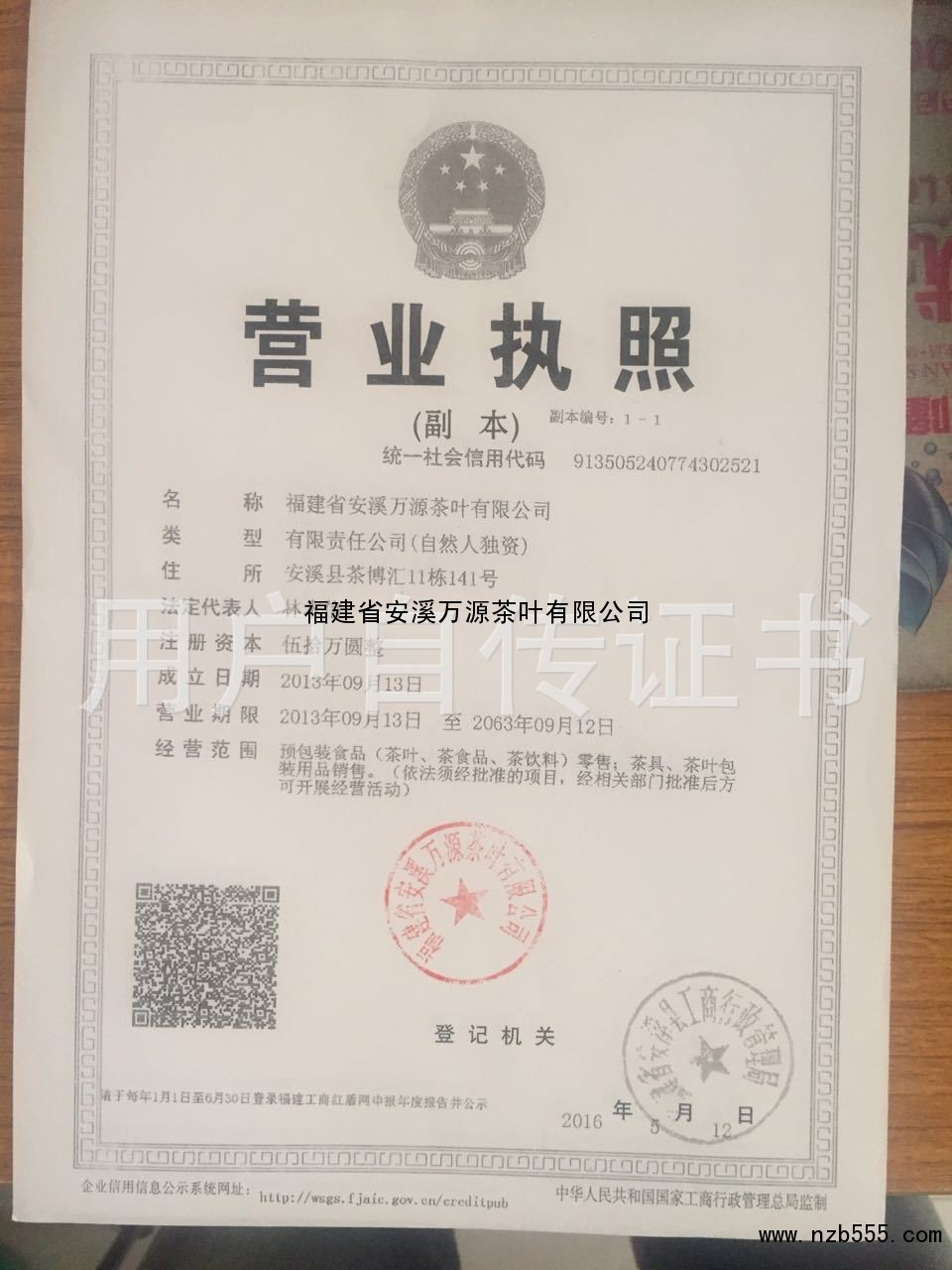| 發(fā)證機(jī)構(gòu): | 福建省安溪縣工商行政管理局 | 發(fā)證時(shí)間 : | 2016-05-12 |