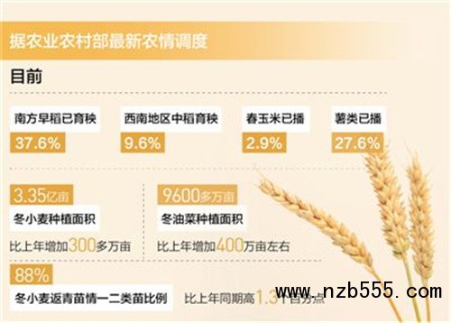 當前,全國春季農業生產如火如荼,正由南向北漸次展開。據農業農村部最新農情調度,目前全國春播糧食已播4.5%,其中,南方早稻已育秧37.6%,西南地區中稻育秧9.6%,春玉米已播2.9%,薯類已播27.6%。今年冬小麥、冬油菜種植面積雙雙實現恢復增長。冬小麥種植面積3.35億畝,比上年增加300多萬畝;冬油菜種植面積9600多萬畝,比上年增加400萬畝左右。冬小麥返青苗情一二類苗比例88%,比上年同期高1.3個百分點。多數地方冬小麥、冬油菜長勢好于上年,實現夏季糧油豐收有較好基礎。