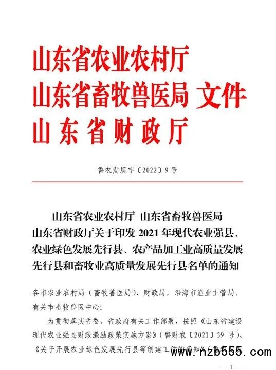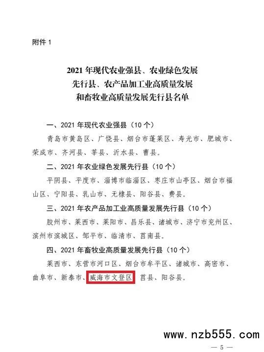 按照山東省農業農村廳、山東省畜牧獸醫局、山東省財政廳《關于印發2021年現代農業強縣、農業綠色發展先行縣、農產品加工業高質量發展先行縣和畜牧業高質量發展先行縣名單的通知》(魯農發規字〔2022〕9號),威海市文登區被確定為2021年山東省畜牧業高質量發展先行縣,為山東省首批獲評的10個縣(市、區)之一。