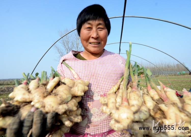 2021年11月4日,河北省磁縣講武城鎮(zhèn)北白道村生姜種植基地內(nèi),種植戶在展示剛剛采收的生姜。河北日報記者杜柏樺攝