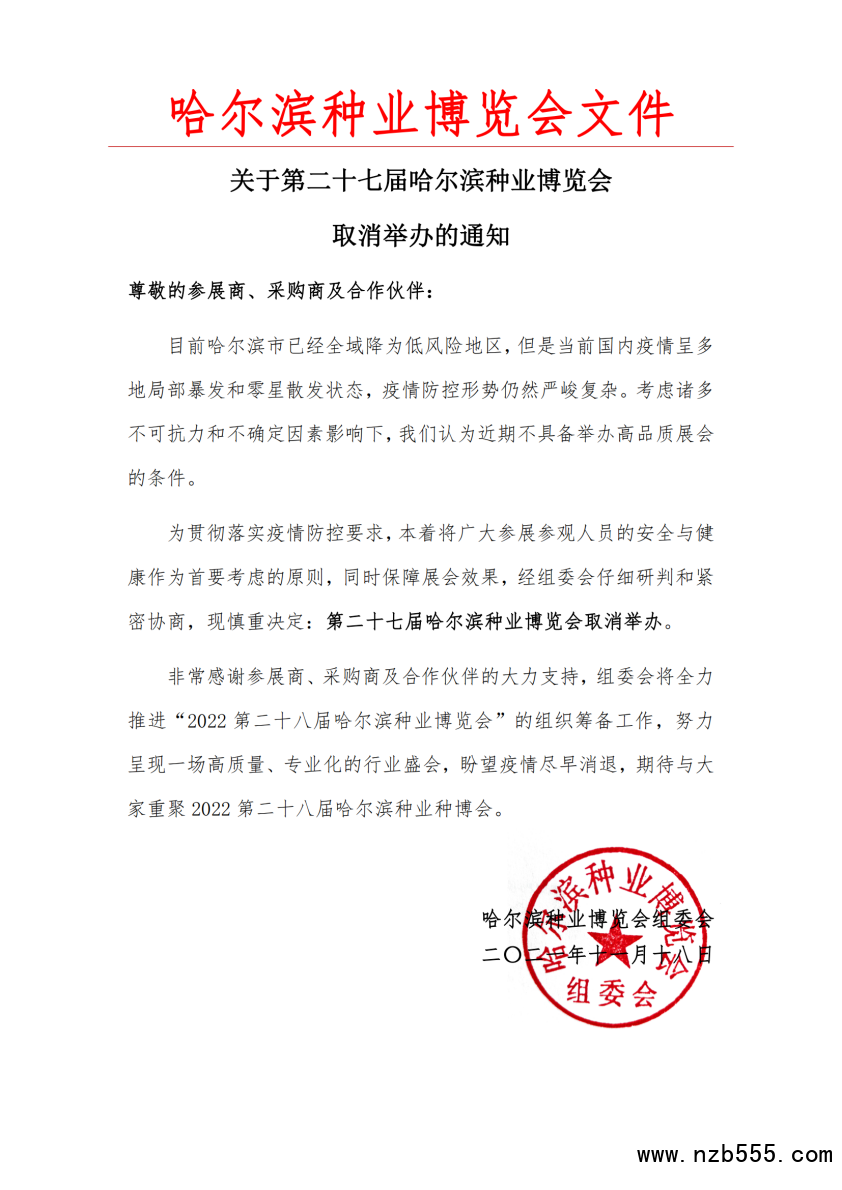 11月18日,從哈爾濱種業博覽會組委會獲悉,為保障展會效果,同時將廣大參展參觀人員的安全與健康作為首要考慮的原則,經組委會仔細研判和緊密協商,現慎重決定:第二十七屆哈爾濱種業博覽會取消舉辦。